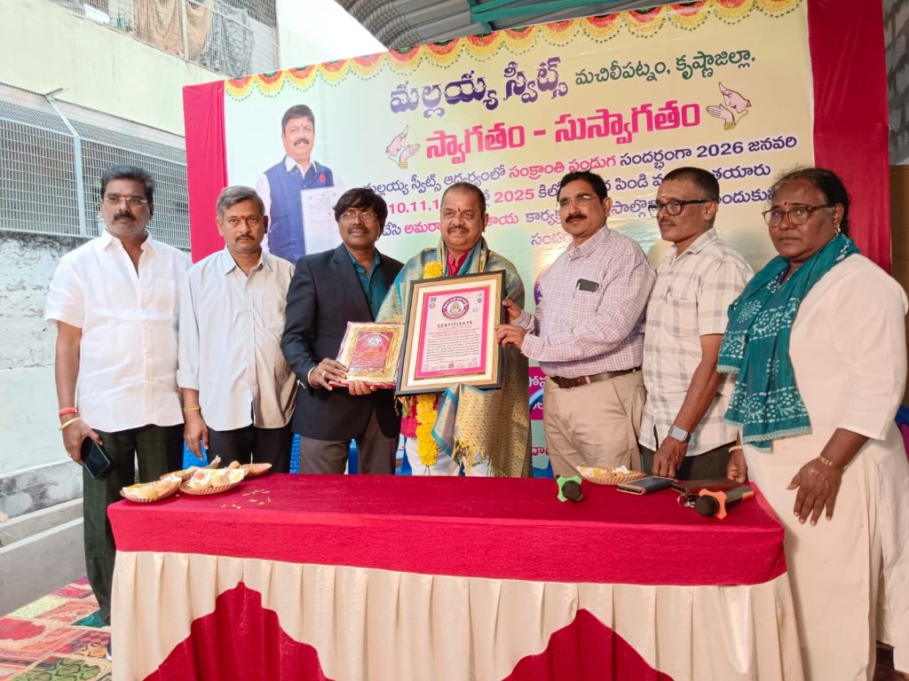 సంక్రాంతి పర్వదినాన్ని పురస్కరించుకొని, గౌర వెంకటేశ్వర్లు గారు 2025 కిలోల పిండి వంటలను—బందరు లడ్డుతో పాటు మరో ఐదు రకాల సంప్రదాయ పిండి వంటలను—తయారు చేయడం ఒక వినూతన ప్రయోగంగా భావించి, దీన్ని తెలుగు బుక్ ఆఫ్ రికార్డ్స్లో నమోదు చేసినట్లు డా. వెంకటాచారి వెల్లడించారు.స్వీట్స్ తయారీలో పాటించిన పరిశుభ్రత, నాణ్యత ప్రమాణాలను పరిశీలించిన అనంతరం ఈ అవార్డును ప్రదానం చేసినట్లు ఆయన తెలిపారు.
